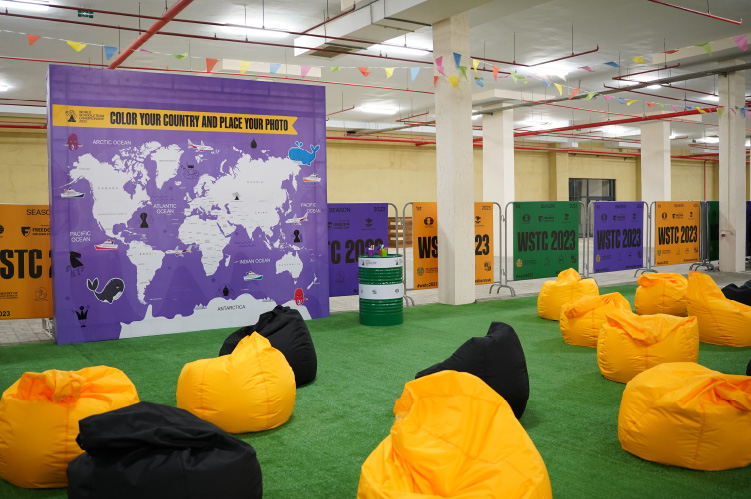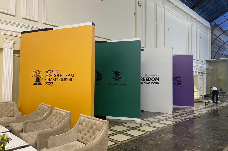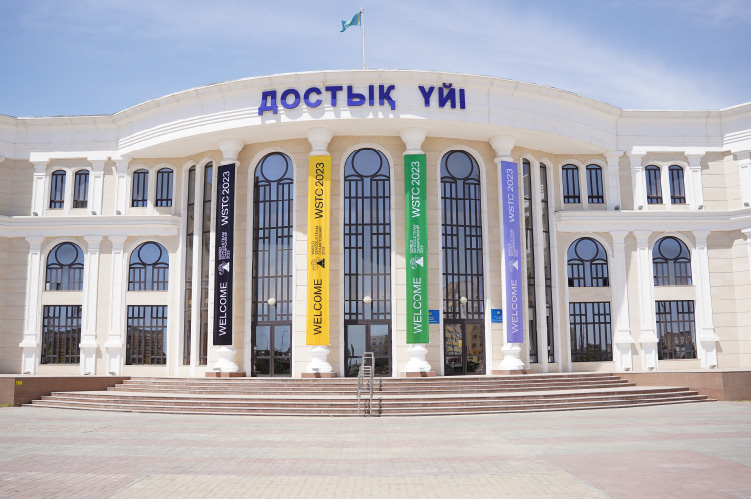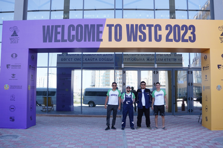 Ну, а наша роль заключалась в одновременном оформлении нескольких локаций. Началось всё с места встречи в аэропорту, затем приняли участие в организации торжественной церемонии открытия World Schools Team Championship в здании Ассамблеи народов Казахстана и далее продвинулись к основному месту событий «Halyk Arena» + оформили сцену в Амфитеатре на набережной.